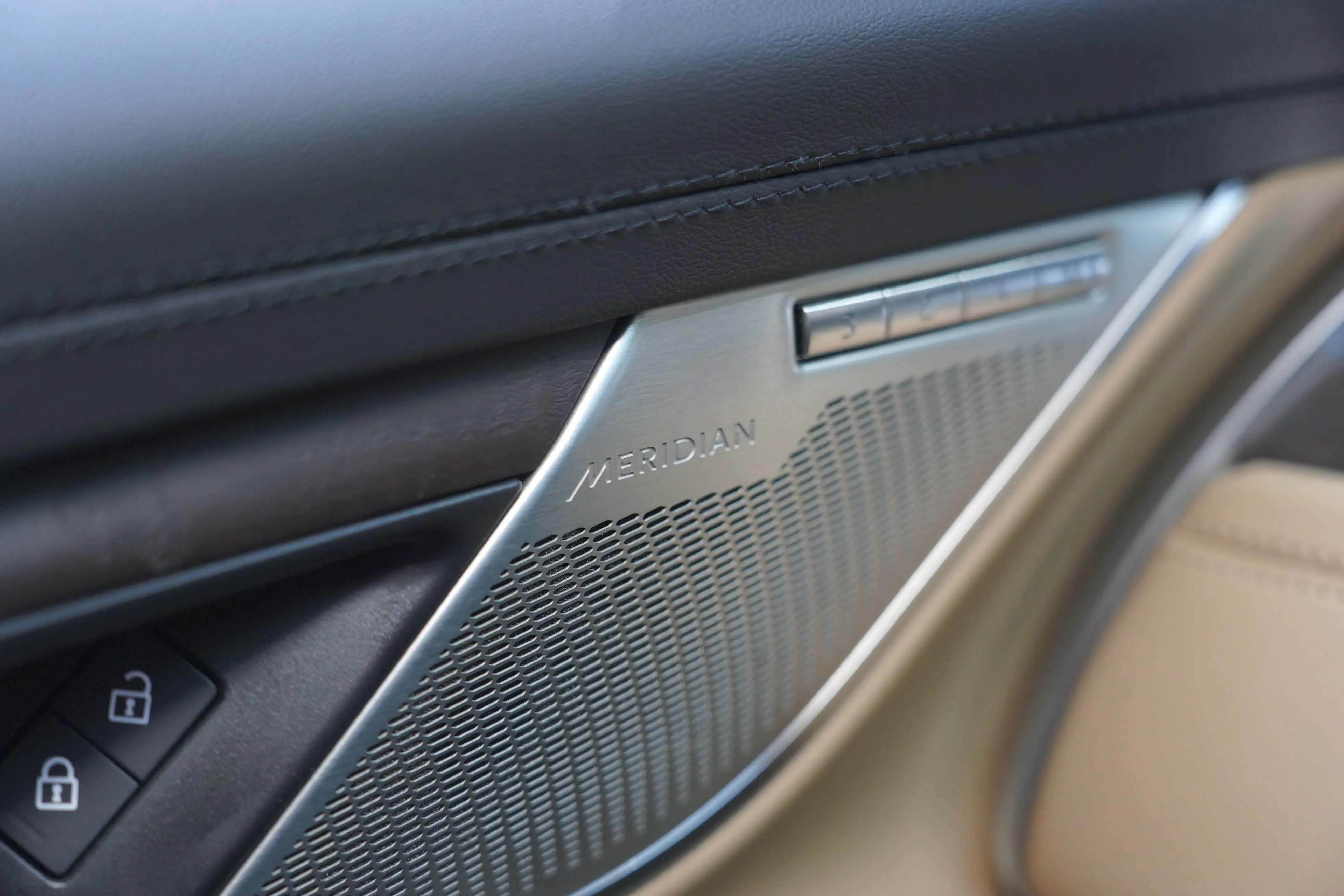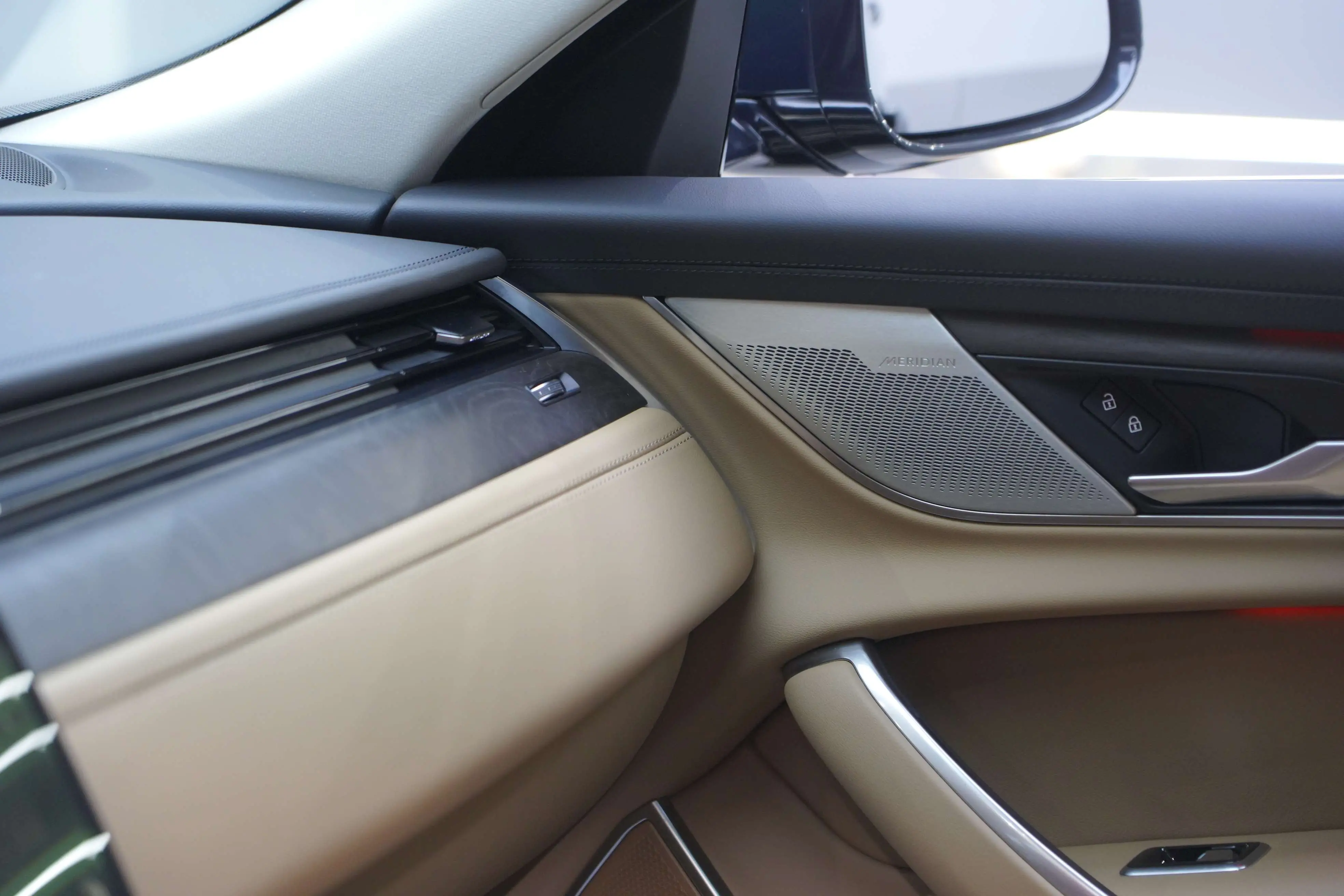 Черная глянцевая решетка радиатора, черный логотип в виде головы леопарда, украшения на боковых крыльях, корпуса наружных зеркал, черная контрастная крыша, сетка цвета цвета шампанского, декоративный элемент нижнего воздухозаборника, накладки на боковые к