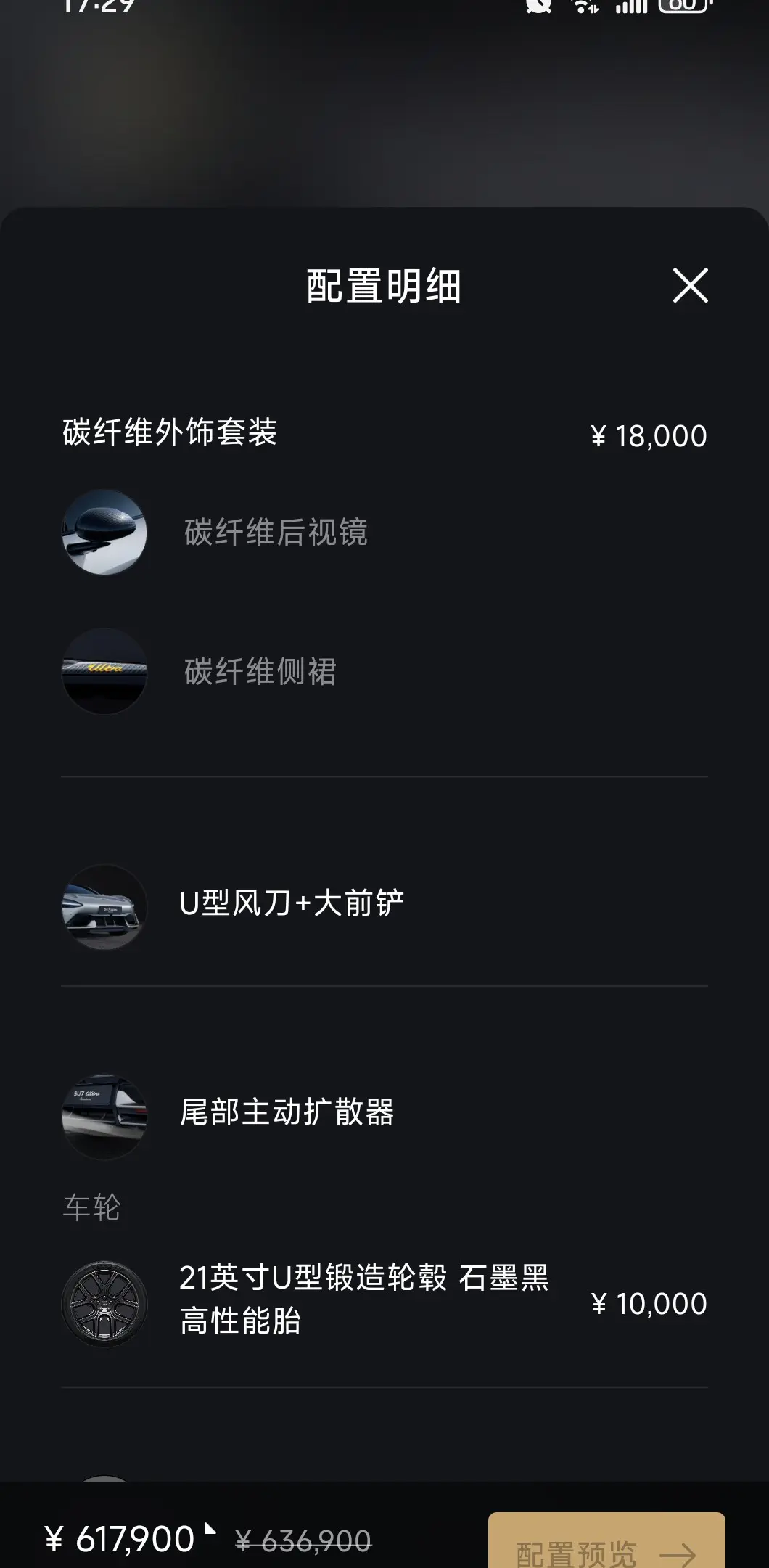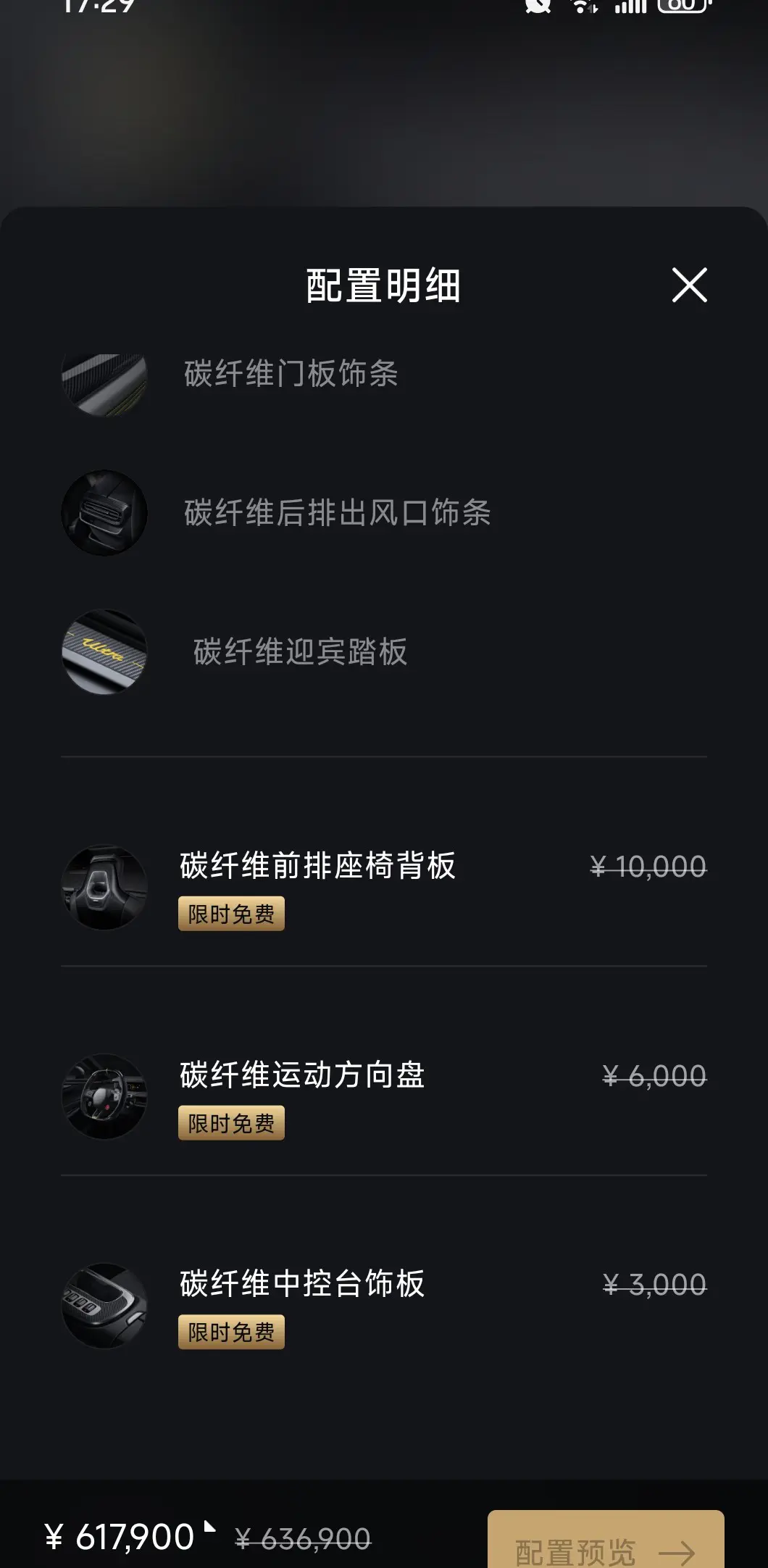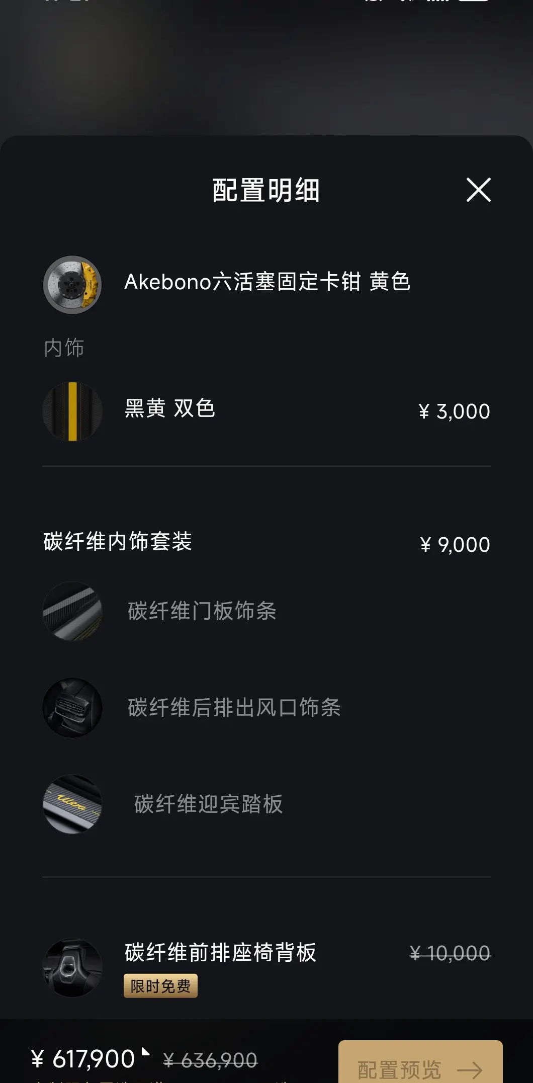 Имеются 4 накладки на дверные панели из углеродного волокна, 1 накладка на задний воздухозаборник из углеродного волокна и 2 накладки на педали из углеродного волокна.