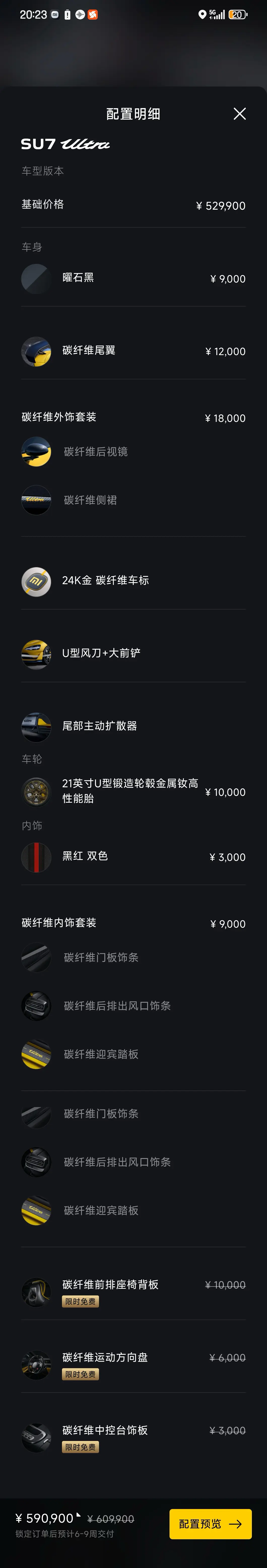 Добавлены два новых аэродинамических воздуховода для эффективного направления воздуха спереди; общая площадь составляет 1,73 квадратных метра, а общий вес снижен на 1,3 кг, что делает ваш SU7 Ultra уникальным и гордым. *После опции наклейки покрывают толь