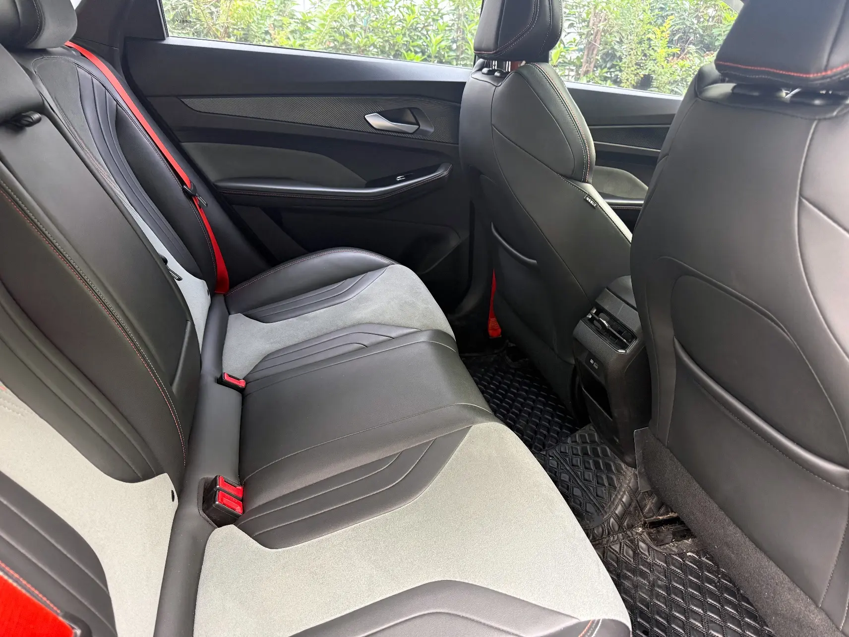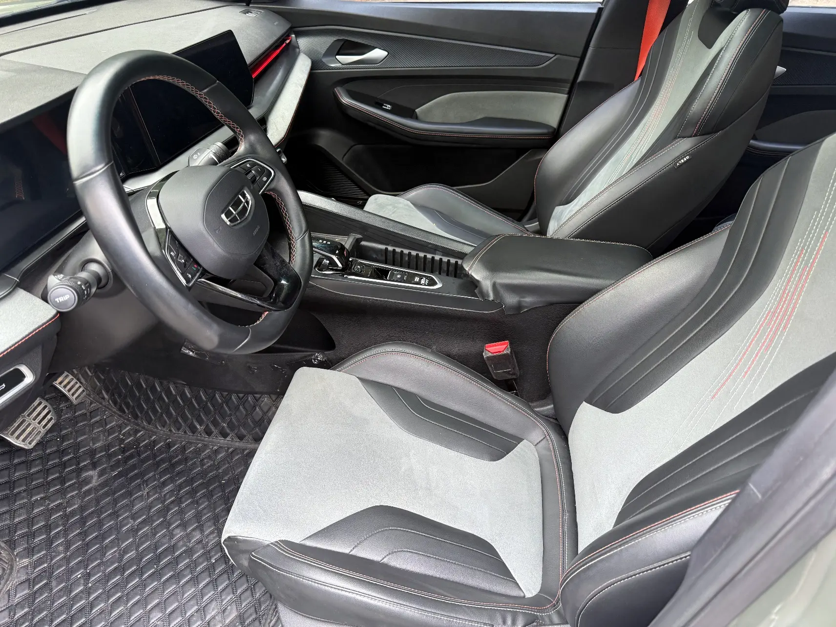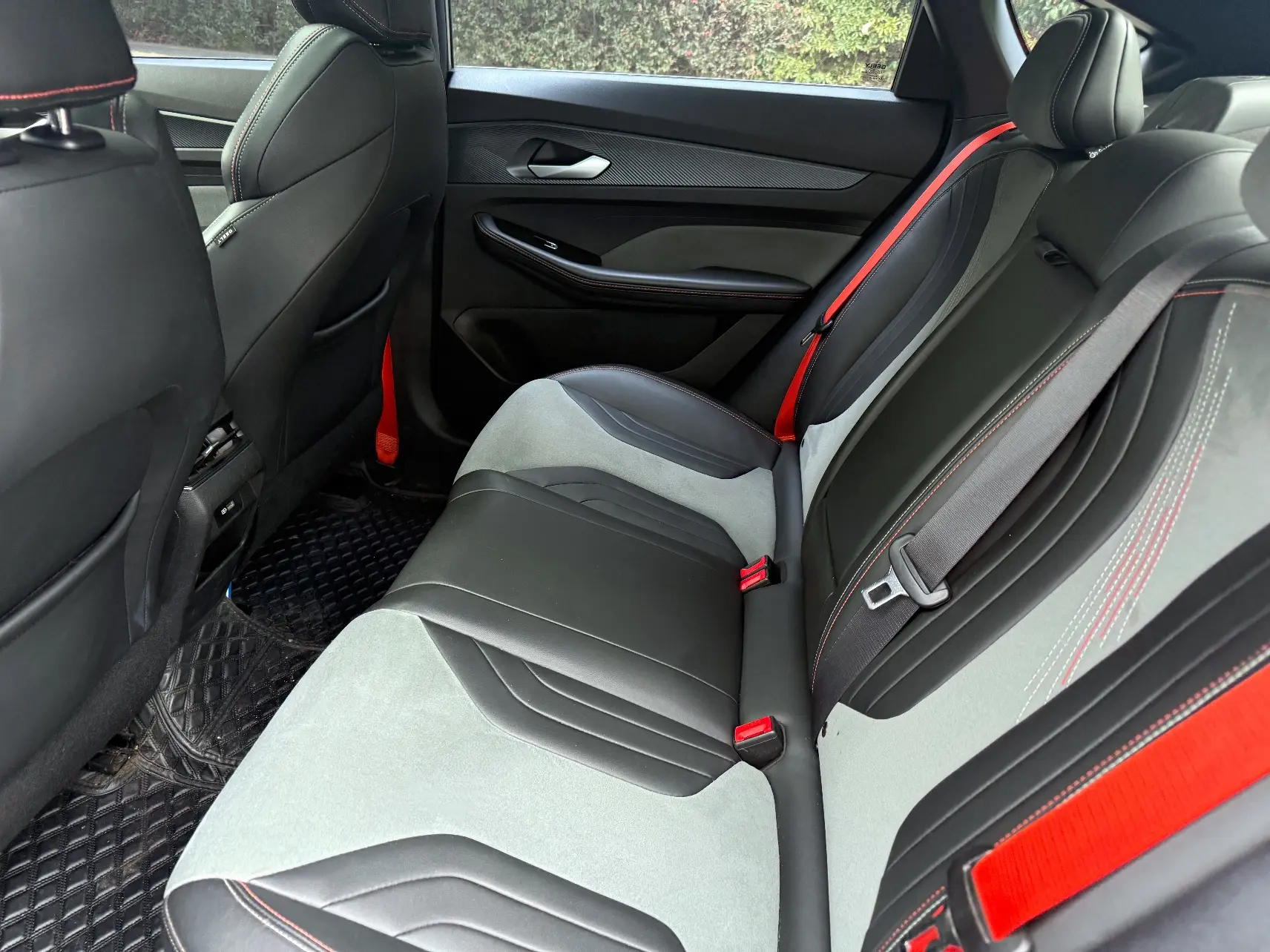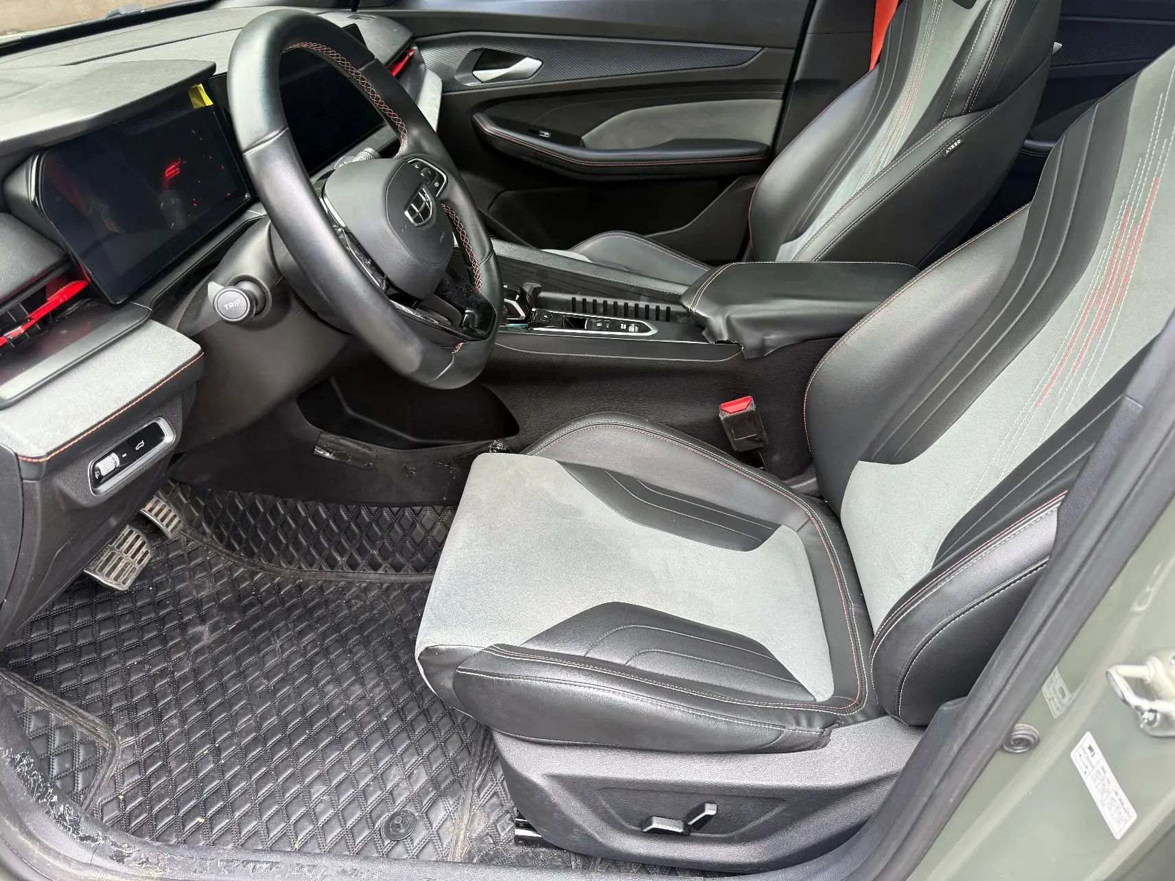 Спортивный логотип F + персонализированный логотип «95», молниеносно-оранжевый комплект, черная краска, черные ветрозащитные колеса, производительные суппорты, двойная отделка салона, напоминающая замшу (штормовой серый/ярко-зеленый), оранжевые спортивные