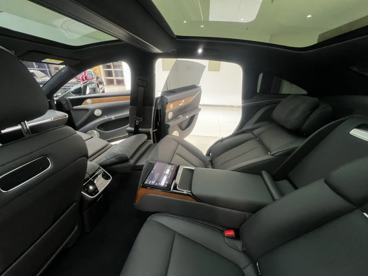 Задние сиденья оснащены системой невесомости, электрорегулировкой в 12 направлениях, электронными ремнями безопасности и небольшим столиком на правом заднем сиденье.