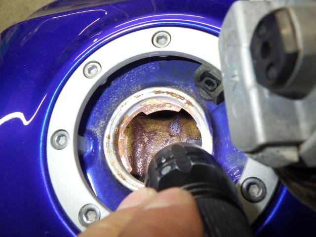 - резервуар: вмятина большой царапина(ы) краска. краска трещина полностью покрашен. внутри ржавчина большой