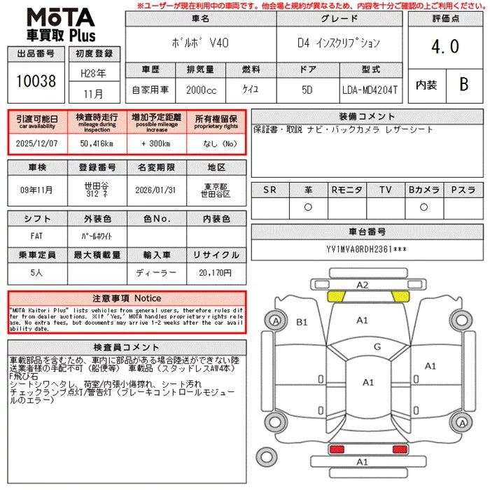 Volvo V40 с аукциона Японии MOTA Kuruma Kaitori Plus лот № 10038