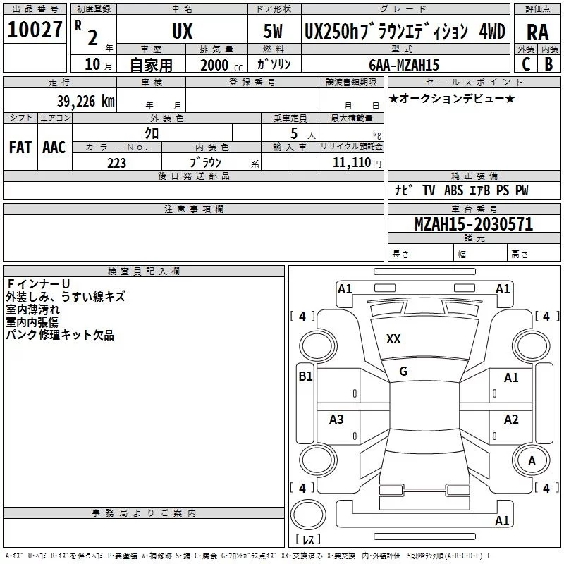 Lexus UX с аукциона Японии TAA Hyogo лот № 10027