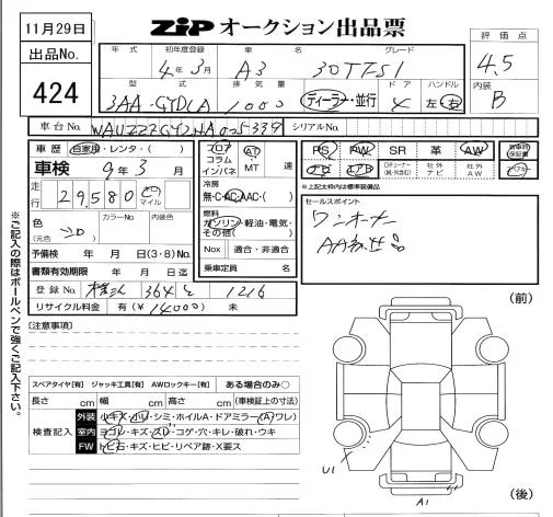 Audi A3 с аукциона Японии ZIP Tokyo лот № 424