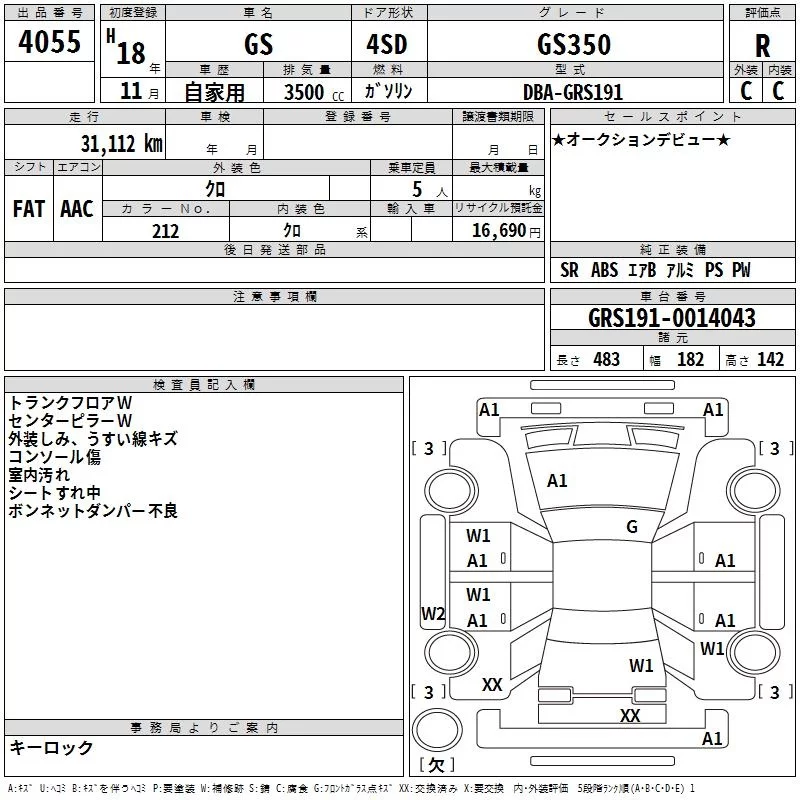 Lexus GS с аукциона Японии TAA Hiroshima лот № 4055