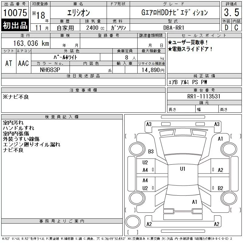 Honda ELYSION с аукциона Японии CAA Tokyo лот № 10075