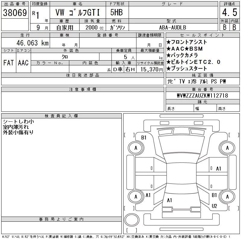 Volkswagen GOLF с аукциона Японии CAA Tokyo лот № 38069