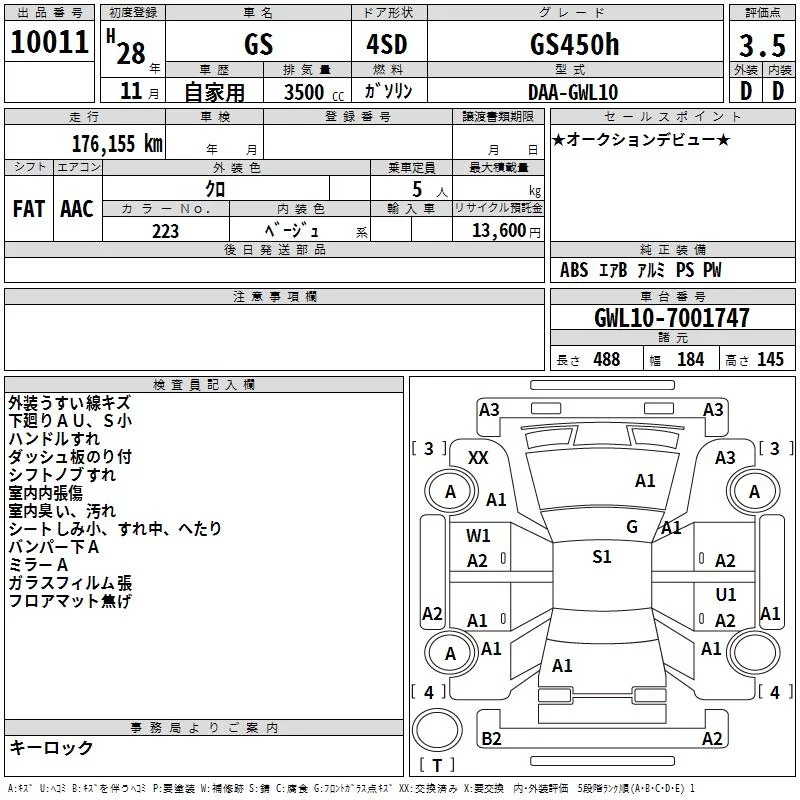 Lexus GS с аукциона Японии TAA Hiroshima лот № 10011