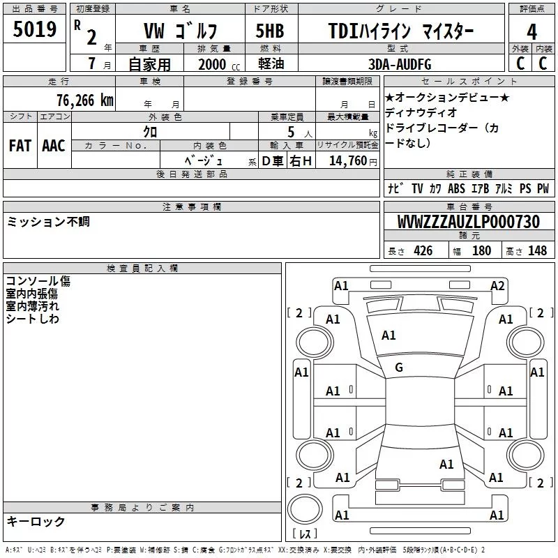 Volkswagen GOLF с аукциона Японии TAA Hiroshima лот № 5019
