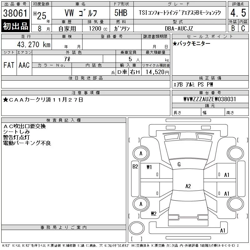 Volkswagen GOLF с аукциона Японии CAA Chubu лот № 38061