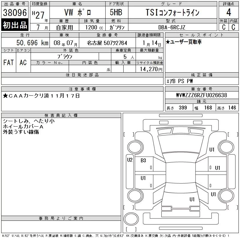Volkswagen POLO с аукциона Японии CAA Chubu лот № 38096