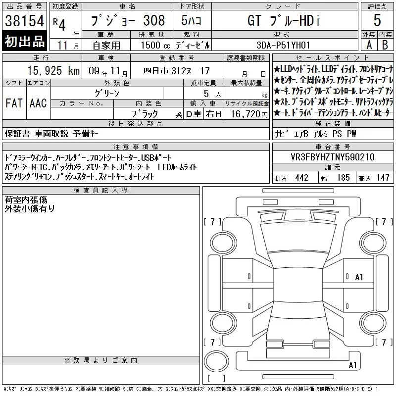 Peugeot 308 с аукциона Японии CAA Chubu лот № 38154