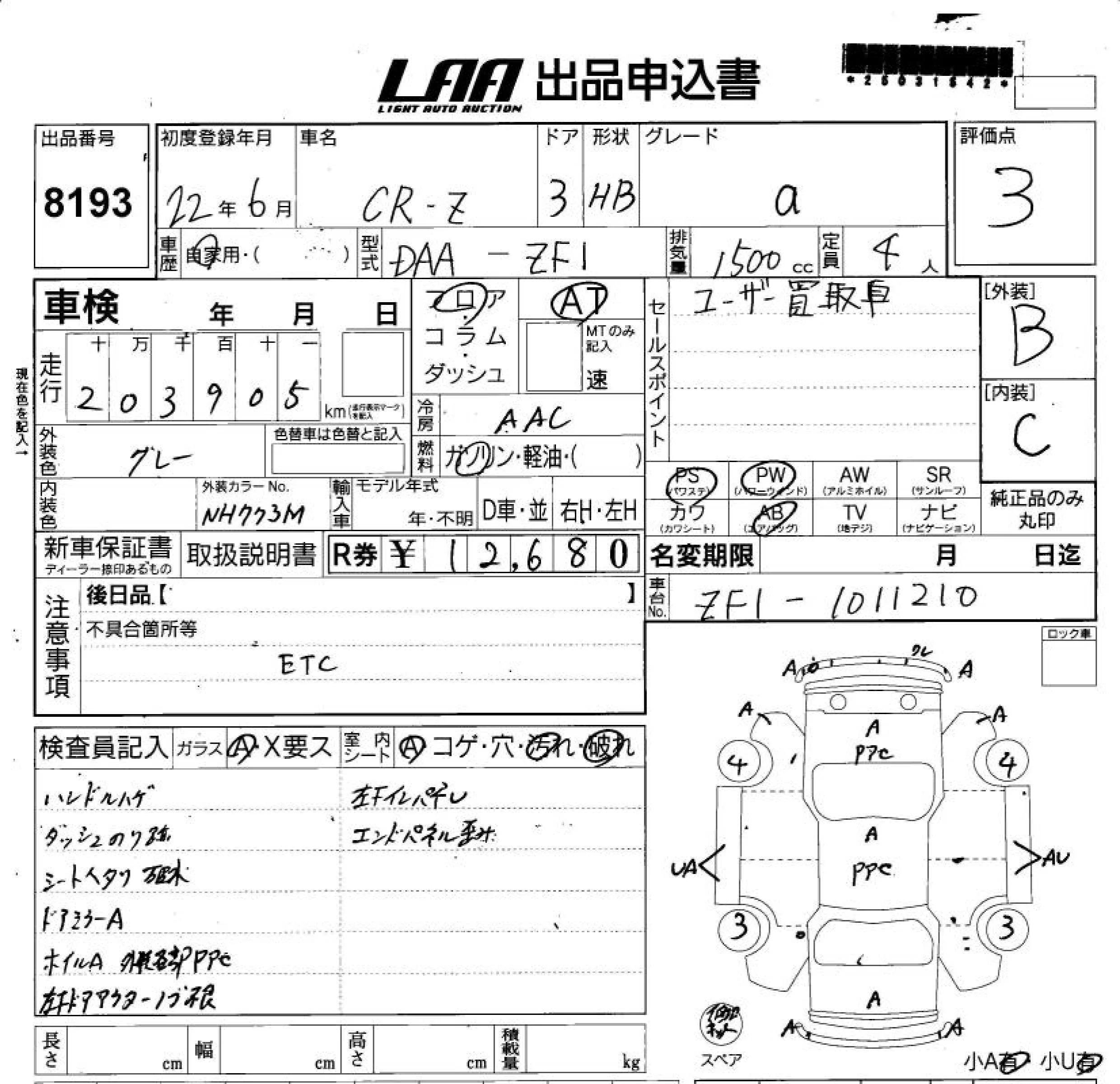 Honda CR-Z с аукциона Японии LAA Shikoku лот № 8193