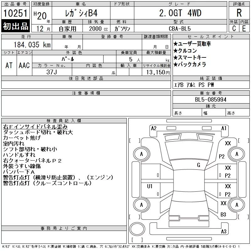 Subaru LEGACY B4 с аукциона Японии CAA Chubu лот № 10251