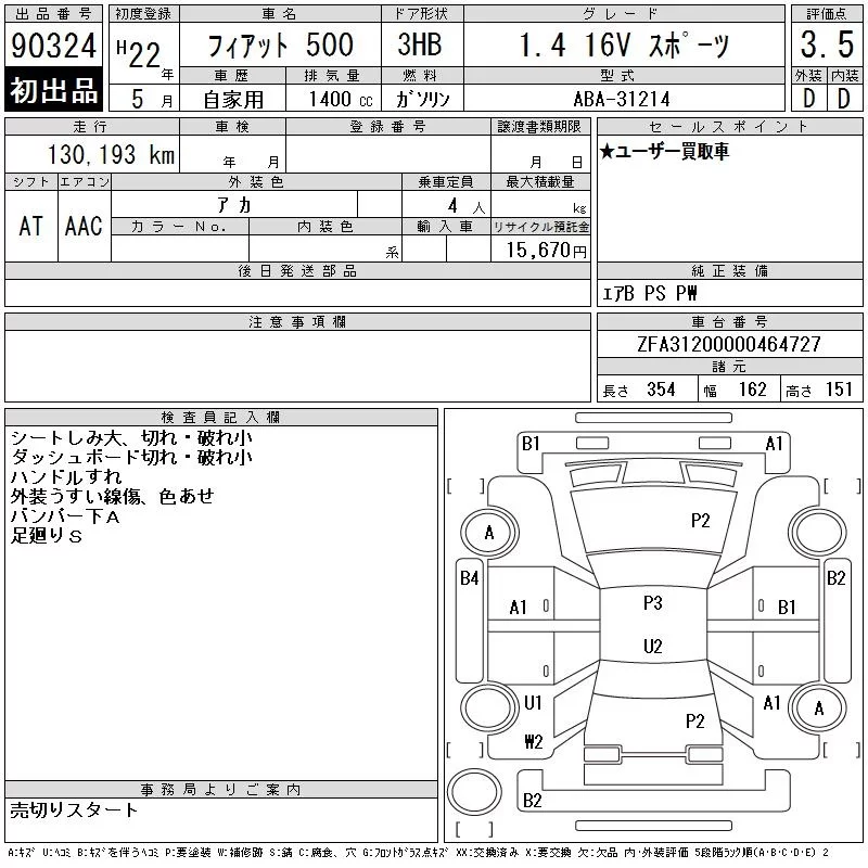 Fiat 500 с аукциона Японии CAA Chubu лот № 90324