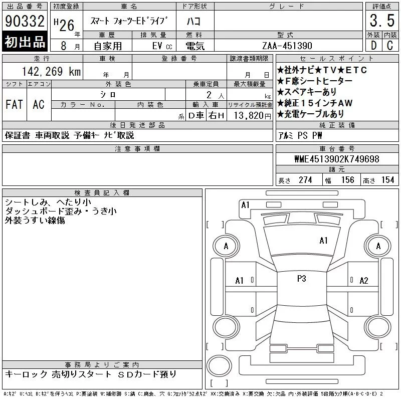 Smart FORTWO с аукциона Японии CAA Chubu лот № 90332