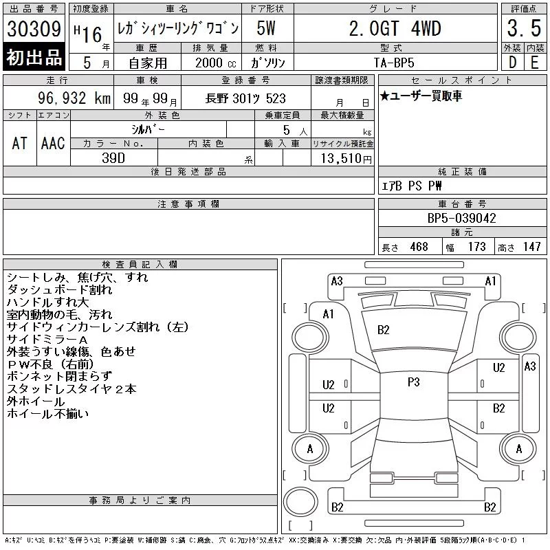 Subaru LEGACY с аукциона Японии CAA Chubu лот № 30309