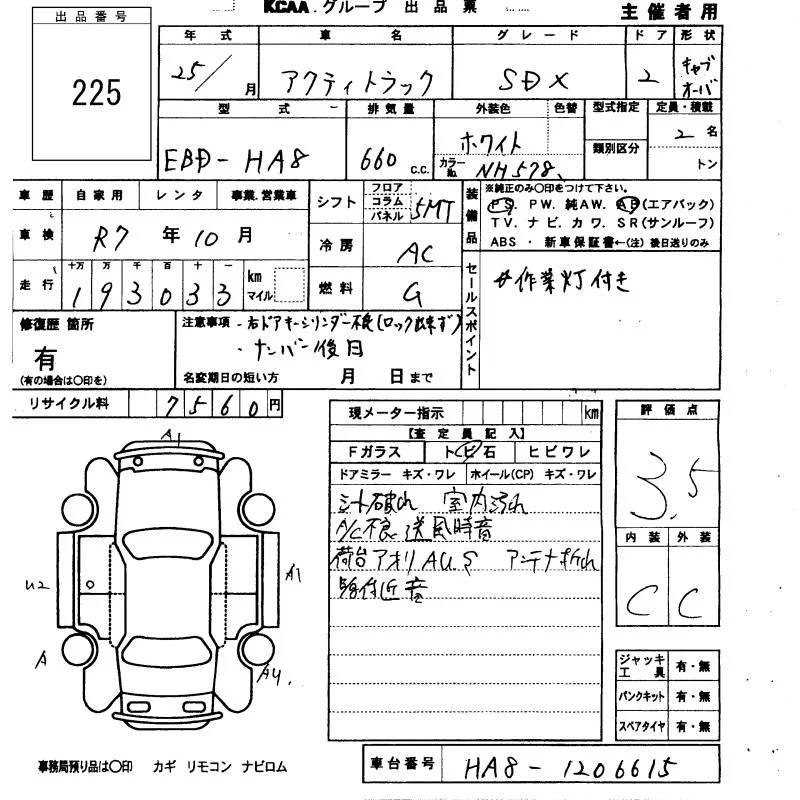 Honda ACTY TRUCK с аукциона Японии KCAA Minami Kyushu лот № 225