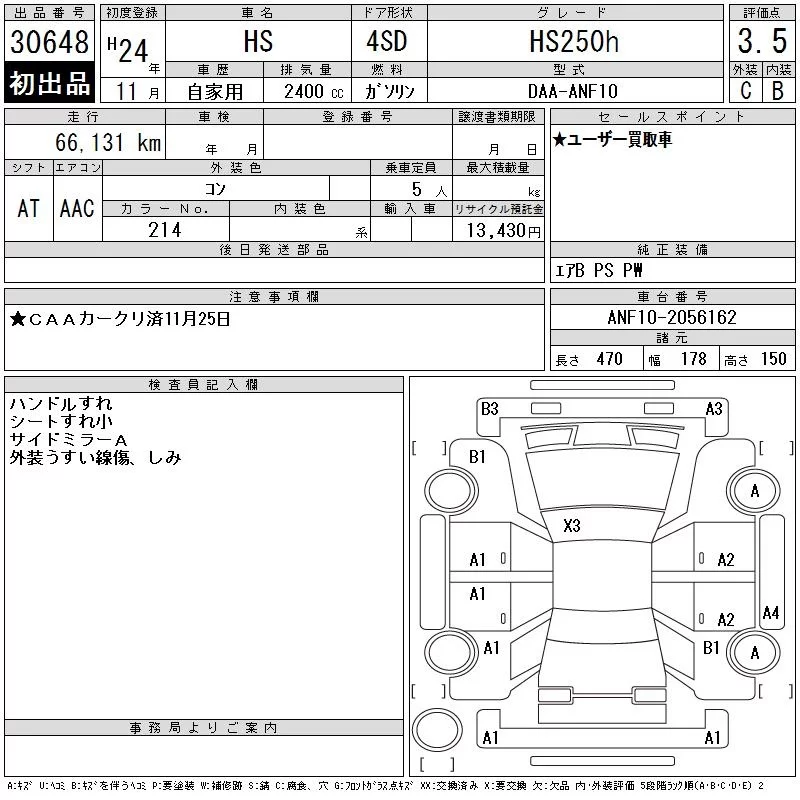 Lexus HS с аукциона Японии CAA Chubu лот № 30648