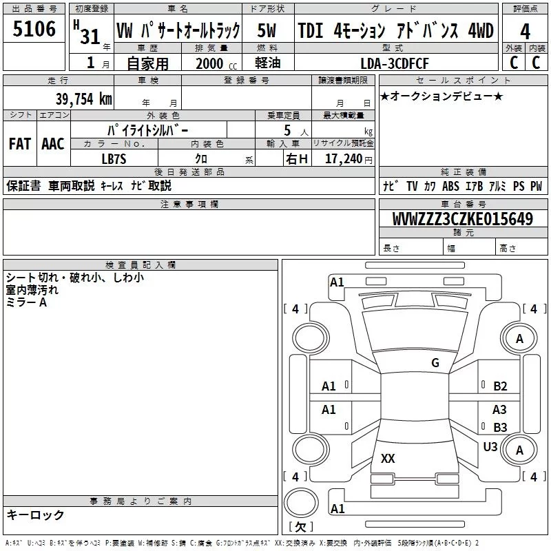 Volkswagen PSSAT ALLTRACK с аукциона Японии TAA Kanto лот № 5106