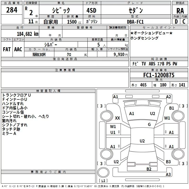 Honda CIVIC с аукциона Японии TAA Chubu лот № 284