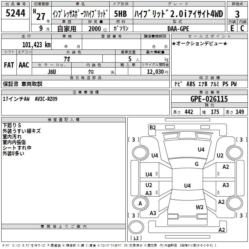 Subaru IMPREZA с аукциона Японии TAA Kanto лот № 5244
