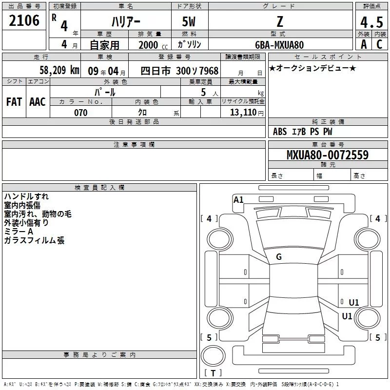 Toyota HARRIER с аукциона Японии TAA Chubu лот № 2106