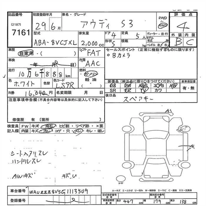 Audi S3 с аукциона Японии JU Gunma лот № 7161