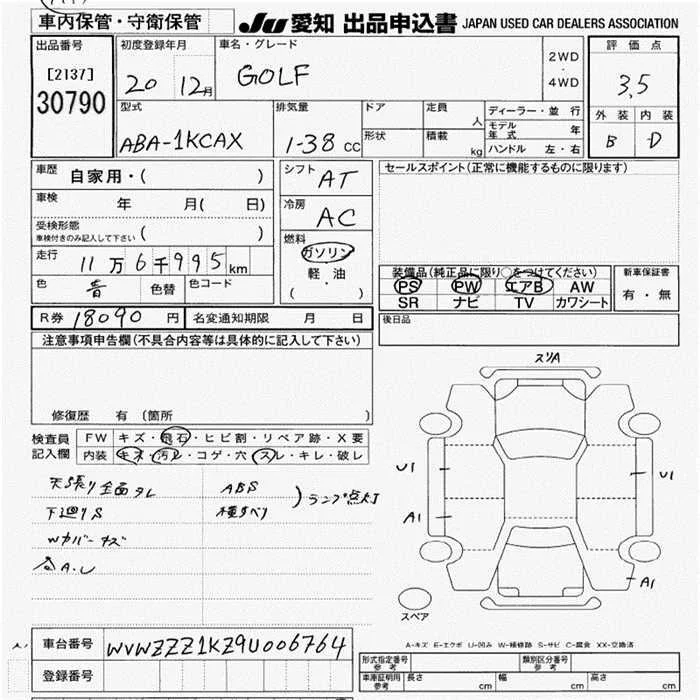 Volkswagen GOLF с аукциона Японии JU Aichi лот № 30790