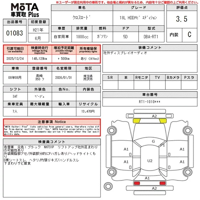 Honda CROSSROAD с аукциона Японии MOTA Kuruma Kaitori Plus лот № 1083