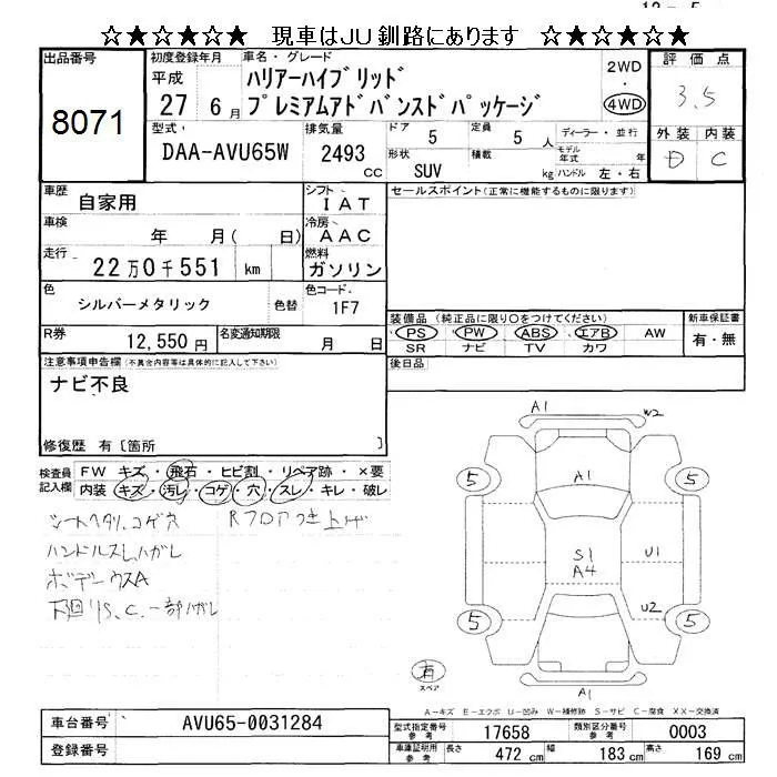 Toyota HARRIER с аукциона Японии JU Hokkaido лот № 8071