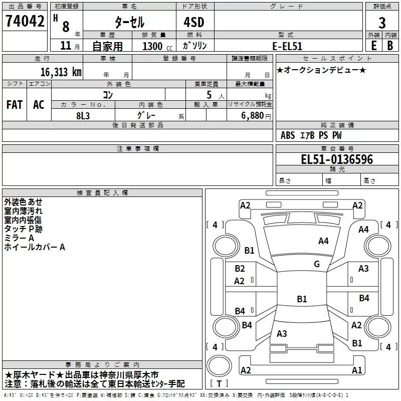 Toyota TERCEL с аукциона Японии TAA Yokohama лот № 74042