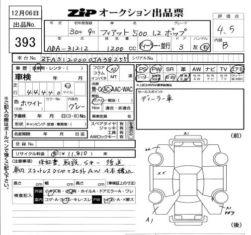 Fiat 500 с аукциона Японии ZIP Tokyo лот № 393