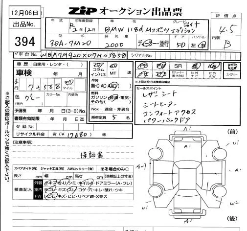 BMW 1-Series с аукциона Японии ZIP Tokyo лот № 394