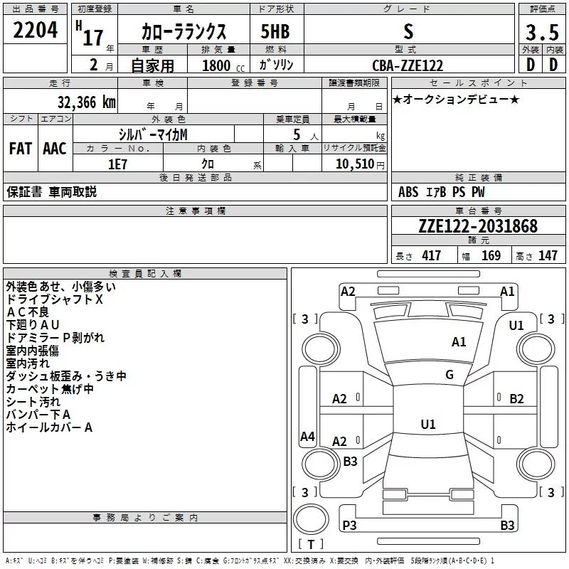 Toyota COROLLA RUNX с аукциона Японии TAA Hyogo лот № 2204