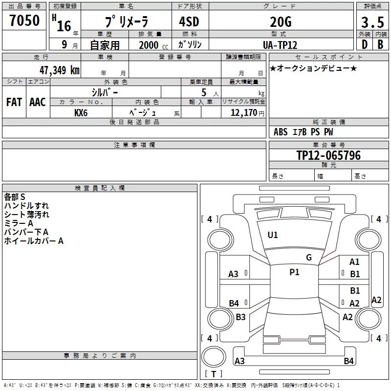 Nissan PRIMERA с аукциона Японии TAA Hyogo лот № 7050