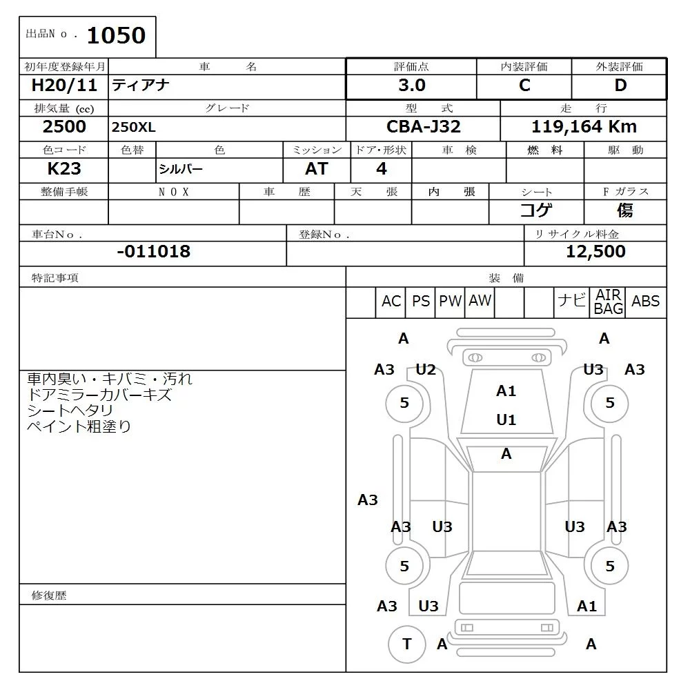 Nissan TEANA с аукциона Японии NISSAN Osaka лот № 1050