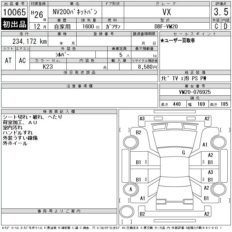 Nissan NV200 с аукциона Японии CAA Tokyo лот № 10065