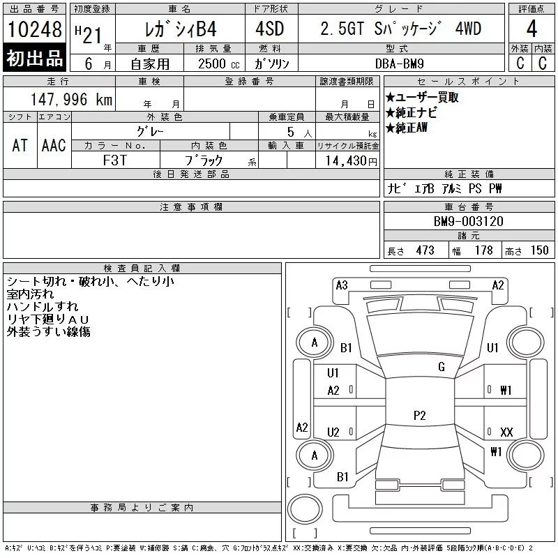 Subaru LEGACY B4 с аукциона Японии CAA Tokyo лот № 10248