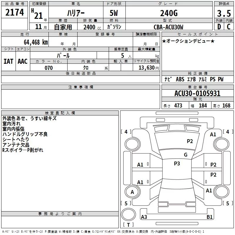 Toyota HARRIER с аукциона Японии TAA Kyushu лот № 2174