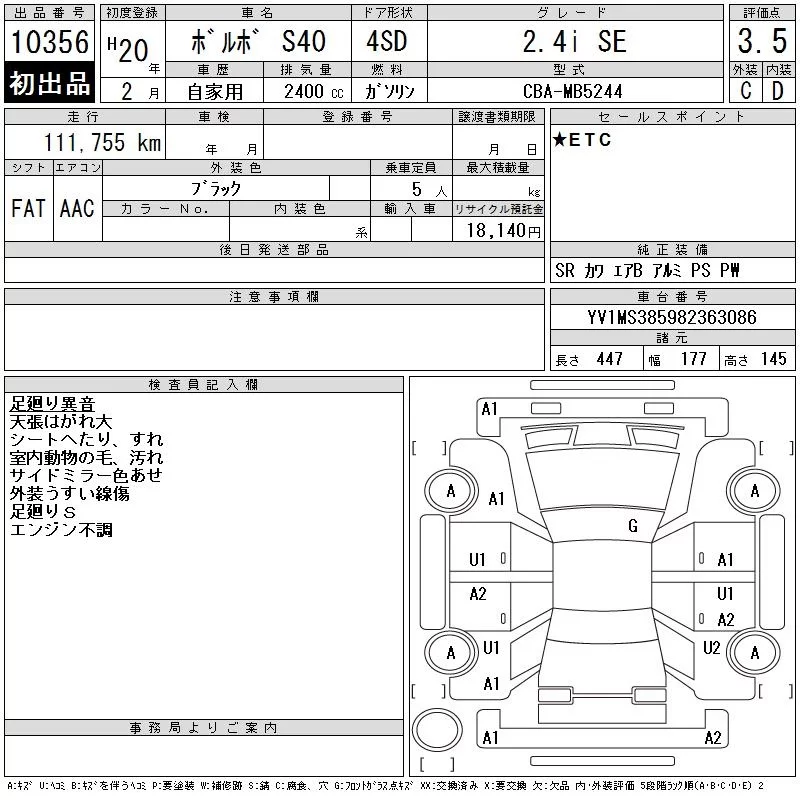 Volvo S40 с аукциона Японии CAA Tokyo лот № 10356