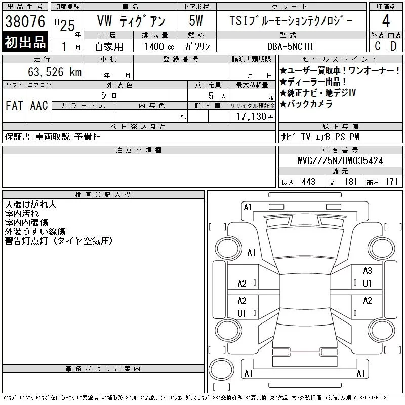 Volkswagen TIGUAN с аукциона Японии CAA Tokyo лот № 38076