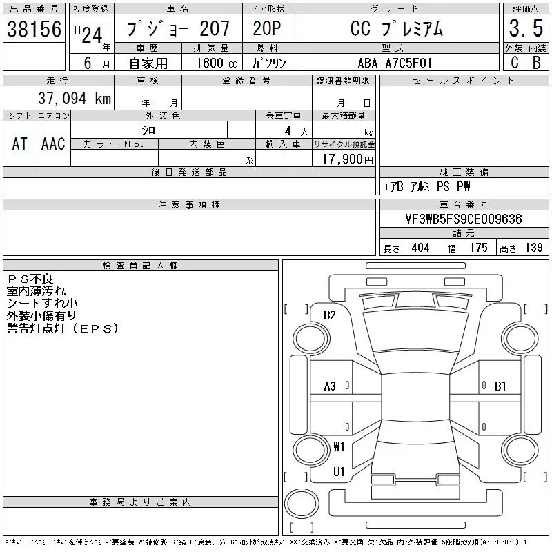 Peugeot 207 с аукциона Японии CAA Tokyo лот № 38156