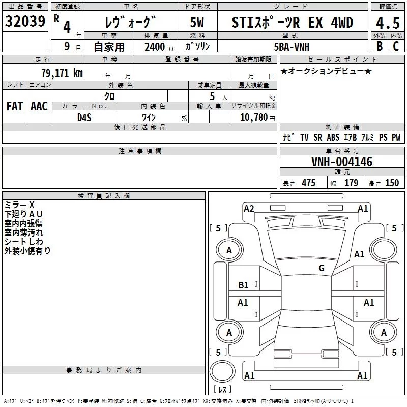 Subaru LEVORG с аукциона Японии TAA Kinki лот № 32039