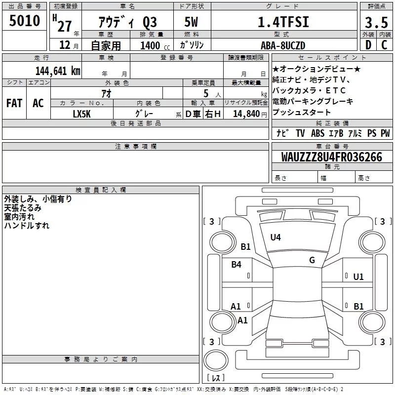 Audi Q3 с аукциона Японии TAA Kinki лот № 5010