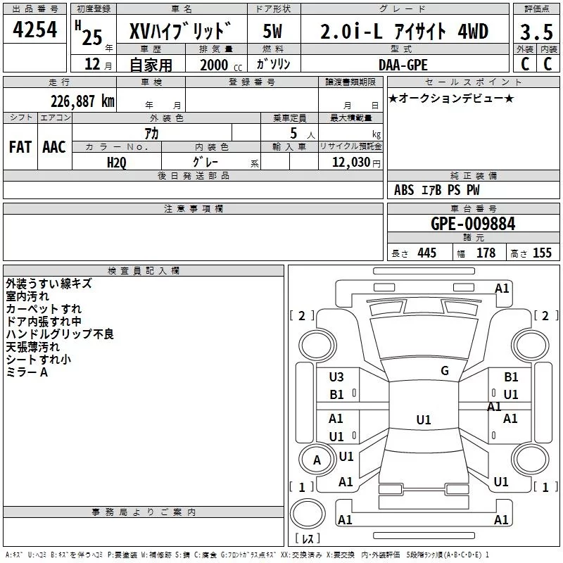 Subaru XV с аукциона Японии TAA Shikoku лот № 4254