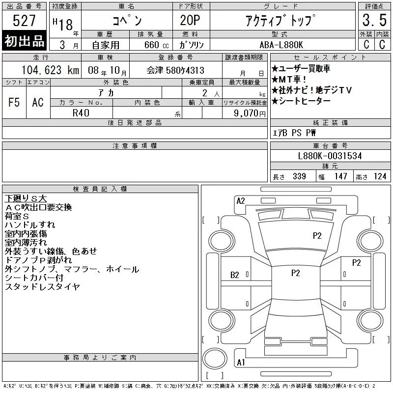 Daihatsu Copen с аукциона Японии CAA Tokyo лот № 527
