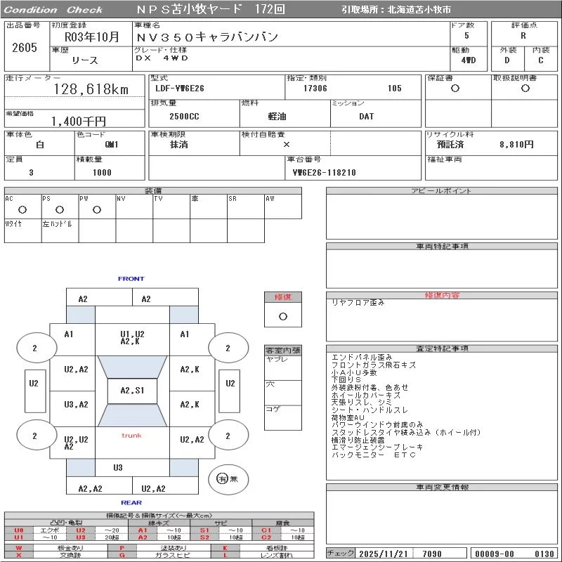 Nissan CARAVAN VAN с аукциона Японии NPS Tomakomai Nyusatsu лот № 2605