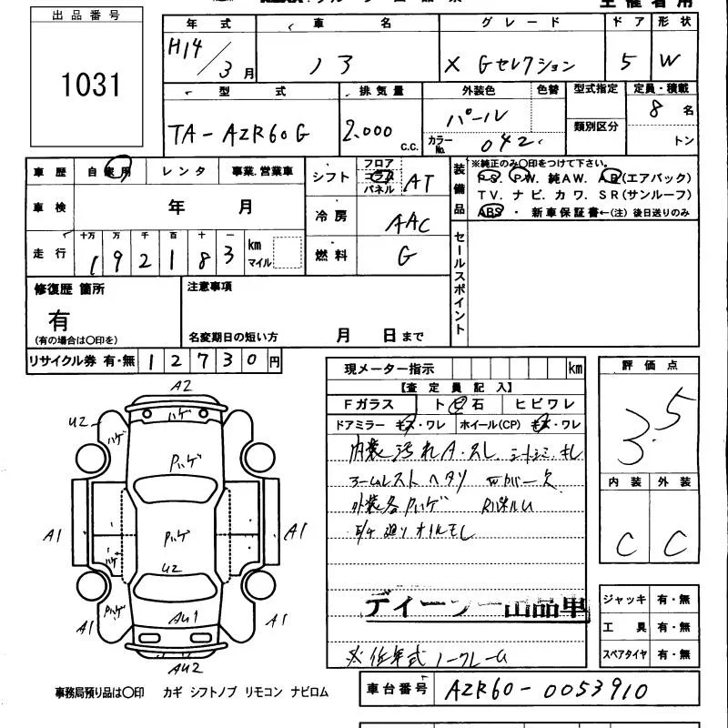Toyota NOAH с аукциона Японии KCAA Minami Kyushu лот № 1031